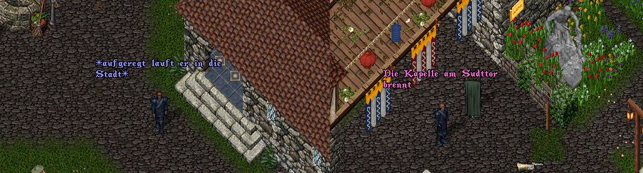 Schnell lief er den kürzesten Weg über den Markt zur Bank dort hielt er die erstbeste Wache auf und teilte ihnen mit dass die Kapelle brennt, schon lief er wieder zurück um Leute zu suchen, die versuchten die Kapelle mit zu löschen, durch die ganze Stadt lief er brüllend, in jede Ecke. Schließlich traf er auf Glaris und teilte auch ihr mit das die Kapelle des Herrn lichterloh brannte und schon lief er weiter ....