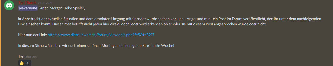 Und bevor nun der Transparenz-Hinweis kommt: Ja, wir haben uns Transparenz auf die Fahne geschrieben und leben diese auch. Wir geben viele Informationen preis, sofern diese Informationen für den Spielbetrieb oder die Entwicklung DNWs spruchreif und entscheidend sind. Ob nun technische oder IG Entwicklungen. Das betrifft jedoch nicht die internen Entscheidungswege innerhalb des Staffs, denn andernfalls müssten wir auch jede eingegangene Bewerbung, jeden Antrag oder jede Beschwerde offen kommunizieren und kommentieren und damit wäre ebenfalls niemandem geholfen.