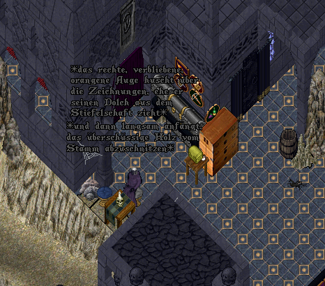Zurück in der dunklen Festung machte er sich sogleich ans Werk, den einen Stamm des Augenbaumes zu bearbeiten. Die Skizze der Ilharess sollte ihm dabei gute Dienste leisten und so fertigte er nach dieser Skizze den Stab an.