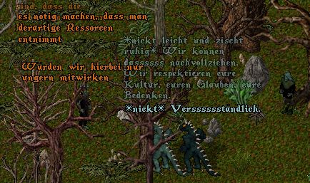 Mit diesen Überlegungen, welche als Referenz die sensorischen Faceten in Einklang mit Handel und Diplomatie zu bringen suchten, scheute er einen weiteren Anstoß zu Ärgernis zu geben. Keine Geheimverhandlungen, kein Betrug. Aus seiner Sicht durfte jeder Waldelf wissen, dass es auch in seinem Volk Vertreter gab, welche Holz schlugen. Dass Sszynzsush selbst Zugang zu einem Eisenbaum hatte, diesen respektvoll behandelt, und er war zuversichtlich, dass die archaische Lebensweise überwiegend im Einklang mit der Umwelt lag, und damit mit der nachhaltigen Nutzung natürlicher Resourcen einher ging.