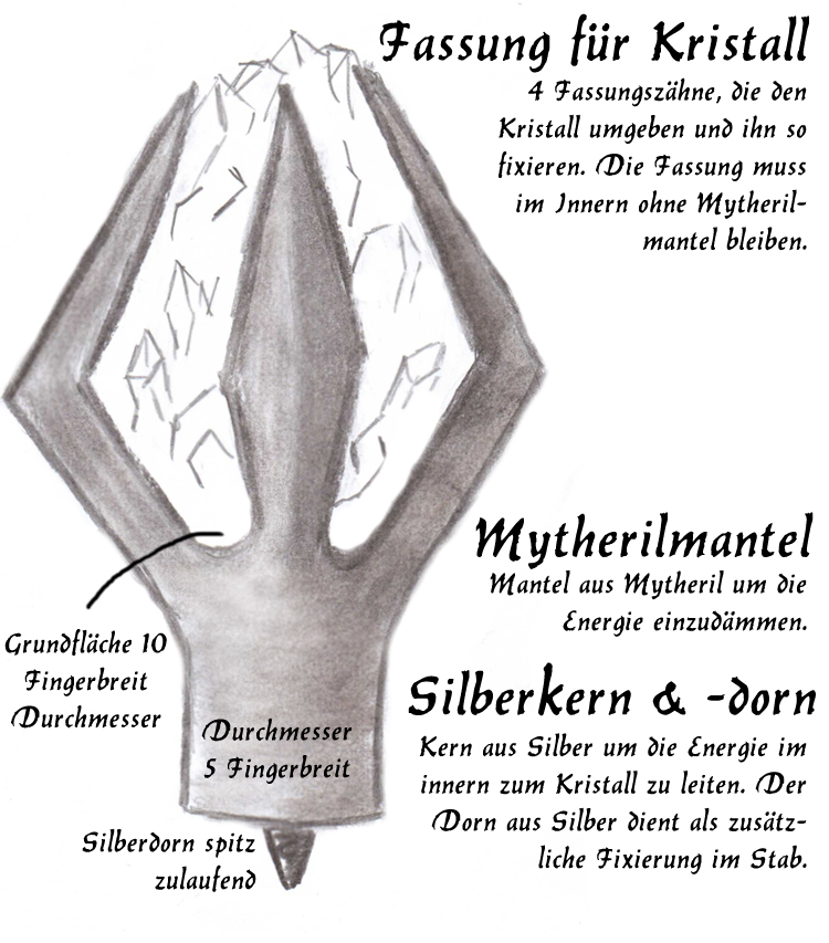 Und dann die Fassung aus Mythril, legiert mit Silber. Dies war heikel, wie lang hält Silber an Mythril? Und so machte er sich kurz vor dem Ritual ans Werk, nur sicher zu gehen, dass es an dem Tag auch dieser Stab oder Artefakt, was auch immer es sein wird, seinen Dienst tut. Die Türe zur Werkstatt abgesperrt, um ja nicht gestört zu werden, macht er sich ans Werk.