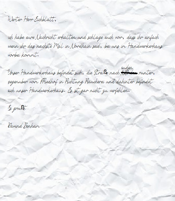"So ihr Zeit habt, findet euch am vierten Tag des kommenden Wochenlaufes zur achten Abenstunde im Handwerkerhaus in Nordhain ein, damit ihr und der Herr Benheim verhandeln könnt. Es wird um eine Antwort erbeten."
