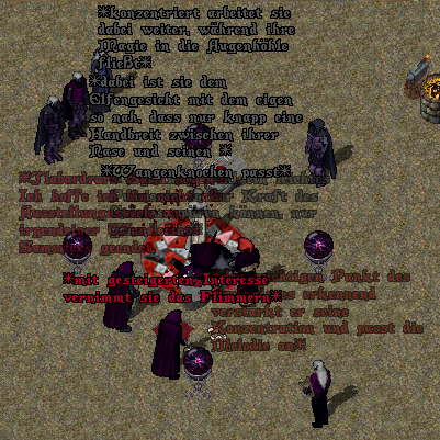 Aber auch Jhal'dril wurde Respekt gezollt für sein Handeln. Während Vyktorya sogleich die letzten Feinheiten an der Augenhöhle fertigstellte. Ehe sie langsam und behutsam damit anfing, das neue Dämonenauge einzusetzen.