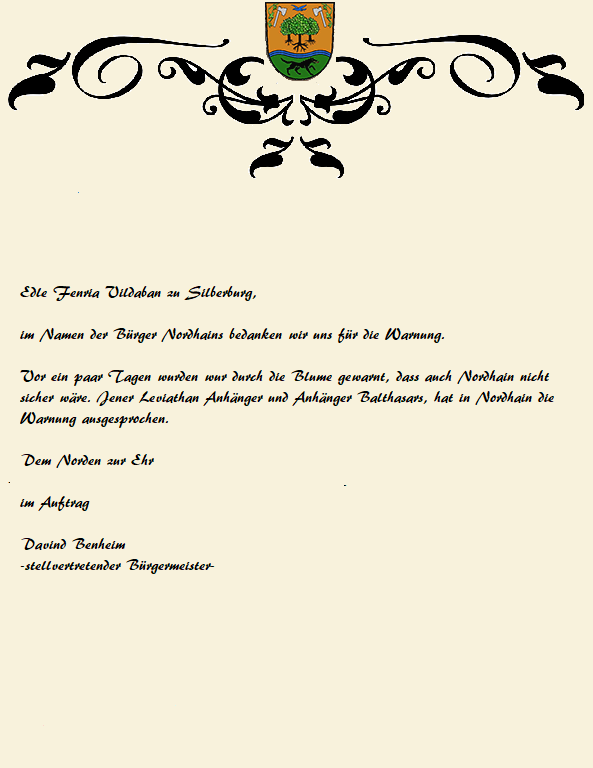 Ich habe vor einigen Tagen mit dem Verwalter des Vasallentums Winterberg, Dirion, gesprochen. Zum Inhalt unseres Gesprächs werde ich in wenigen Tagen die Edle Fenria aufsuchen.