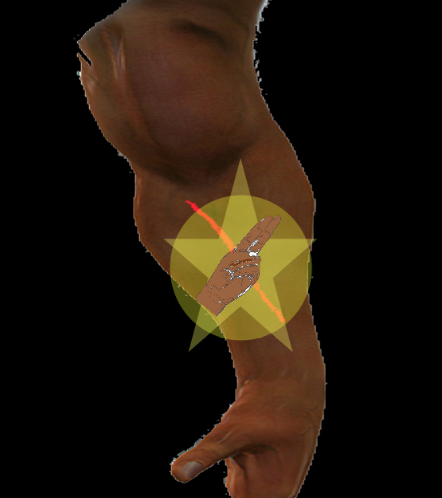 Eine Wunde an seinem Unterarm wird von ihm betrachtet und mit der linken Hand zeichnet er mit Zwei abstehenden Finger ein Ankh über diese,