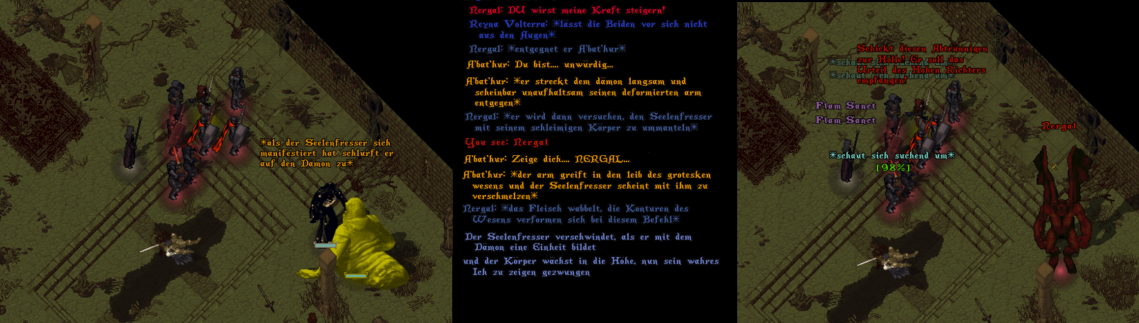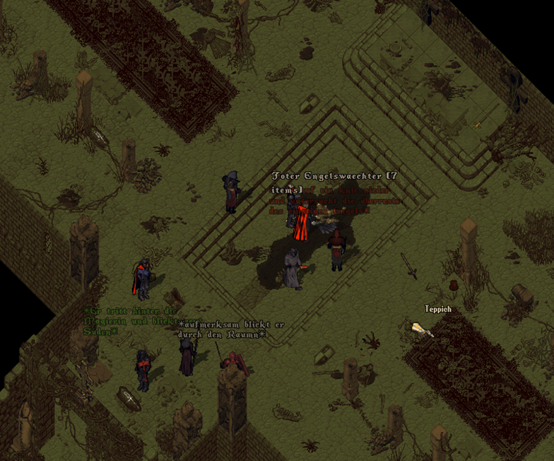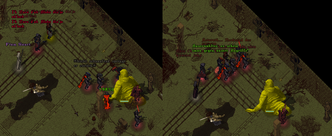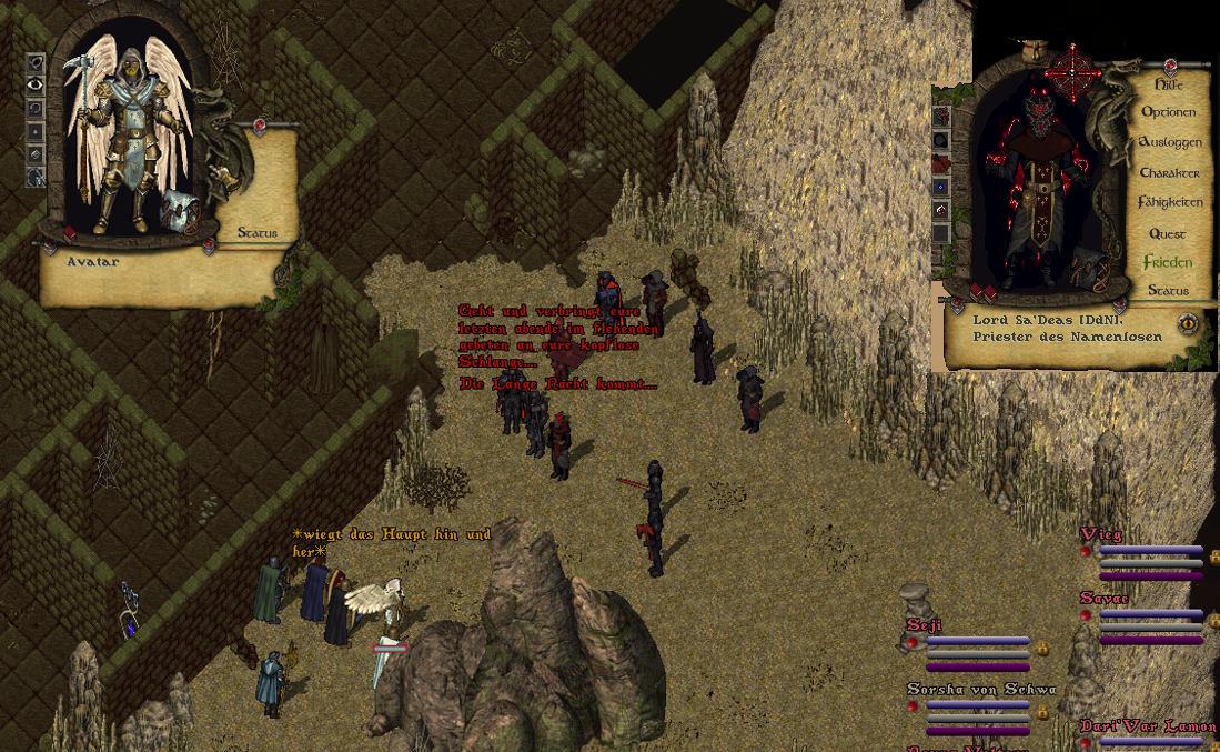 Der Engel schien die Waffe des Hohen Templers zu erkennen, ruhte sein Blick doch ungewöhnlich lange auf dem Hammer. Als er an der Schlachtenreihe der Wächter vorbei in Richtung Sa'Deas blickte bemerkte der Priester eine Art zögern. Ein Unwohlsein hätte man gar meinen können und es schien als würde der himmlische Wächter zu ihm in gewisser Vertrautheit sprechen.