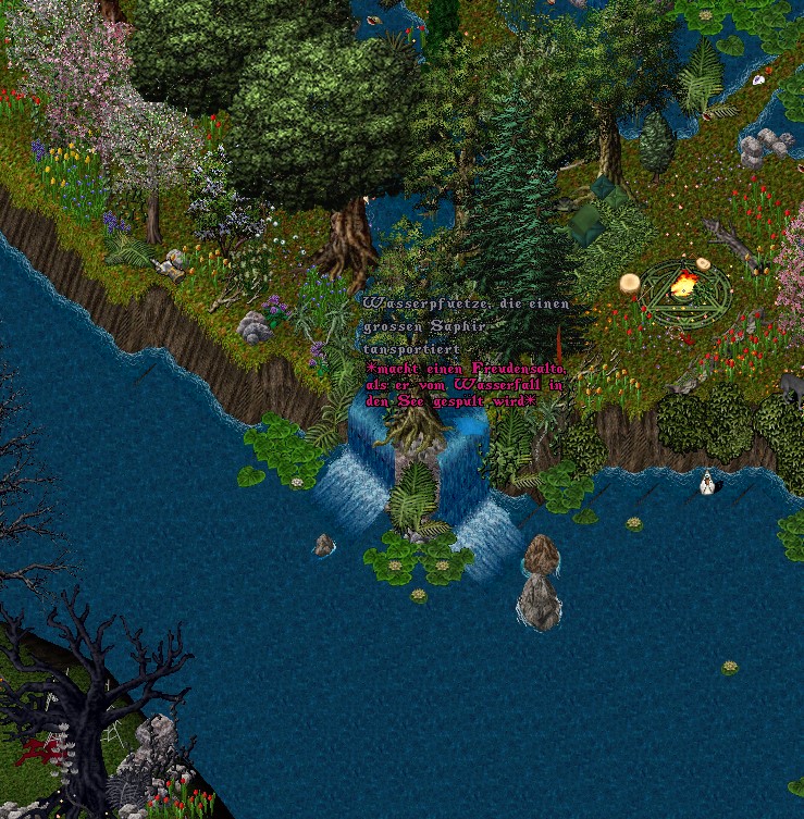 Sie spürte einen gewissen Widerwillen und doch auch den Funken einer vagen Zustimmung. Sie hatte recht. Natürlich hatte sie das. Und ehe sie einen weiteren Gedanken darüber verschwenden konnte, was der Ursprung der Wellen und des Unwohlseins war, brach eine Gestalt aus dem Wasser. Ein Ruck ging durch ihren Körper, als sich alle Alarmglocken innerlich anschalteten und sich die blaue Gestalt vor ihr aus dem Wasser erhob. Ein Wasserelementar? Ein Wassergeist? Sie hatte gar keine Zeit sich mit diesem Wesen auseinander zu setzen, denn sofort ging jenes in einer Art Rage in den Kampf über. Während sie paddelig und ungeübt aus dem Wasser hechtete und Shezzran an ihre Seite rief, verfolgte der Wassergeist sie mit einem, für sie nicht sonderlich heilvollen, Tempo. Sie hatte vermutlich Glück, dass ihr Vertrauter die Aufmerksamkeit des Geistes auf sich zog, so das sie Zeit hatte sich zu sammeln - begleitet von Naurms mürrischen Geschimpfe in ihrem inneren.