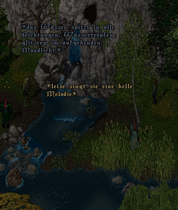 Die Drinne ließ das klare Wasser über sich strömen, unterstützt von den Ermutigungen seiner Waldgeschwister. Sie schnappte nach Luft, als das kalte Bergwasser über ihren Körper fließt; sie schüttelte den Kopf, weiße Haare peitschten, Wasser spitzte in alle Richtungen tatsächlich wurde die Kreatur still unter dem Wasserfall; die Augen schlossen sich, Brust und Schultern hob sich in langsamer Regelmäßigkeit. Mit sichtlich geklärtem Blick trat die Spinnenkreatur aus dem Wasserfall und wurde schließlich wieder zurück zum Platz an dem Faerfeuer brannte geführt. Alle Waldgeschwister versammelten sich um Serafein, nahmen sich an den Händen und bildeten einen Kreis als auch Serafeins Beine angefasst wurden.