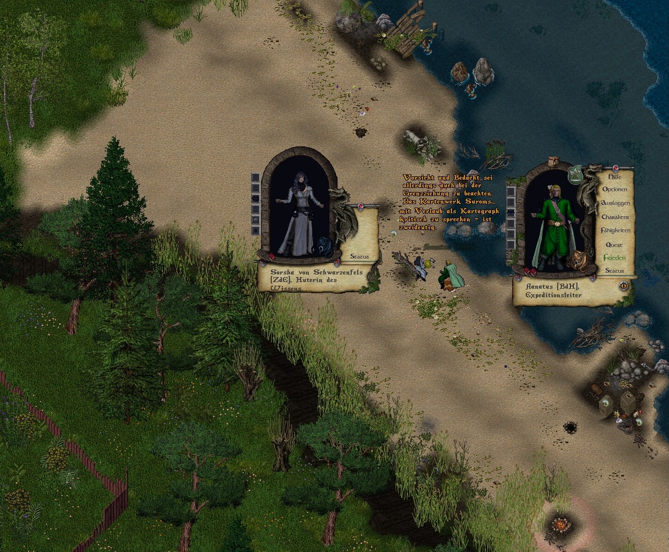 Bald schon verabschiedete sich der müde Aanatus, um schon auf dem Weg zur Taverne die nächsten Gerüchte zu hören: Die Palisade Suroms sei abgebrannt worden. Angeblich gab es einen Disput rund um Nagrons Expedition. Na das kann ja heiter werden… Mürrisch entschloss er sich schlafen zu gehen und am nächsten Morgen das Grenzland zu besuchen.