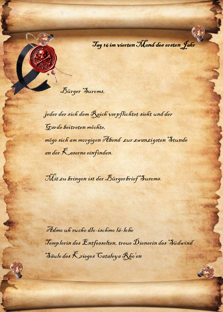 *Parallel dazu wird ein Wachmann Sorsha aufsuchen, um Ihr ein gesiegeltes Pergament zu überreichen.