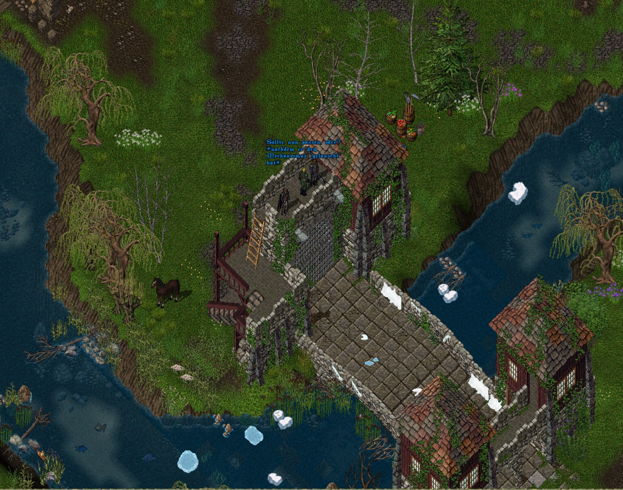 Die Wunden erwiesen sich als oberflächlich, es schien vielmehr so, als hätte das "Geisterwerk", diese arkanen Machenschaften, seinen Geist gelähmt. So fühlte er zumindest am nächsten Tag, äußerlich nur etwas zerschrammt, aber mit einer gewissen Erschöpfung im Kopf. Er wollte sich ablenken, die Träge loswerden und beschloss, ein zweites Mal den neu gebauten Brückenbereich Nebelhafens zu begutachten. Müde ritt er selbst die kurze Distanz von der Falkenrast zum Tor, sattelte ab und nahm die Brückenbefestigung unter die Lupe. Wie schon bei der ersten Besichtigung, eigentlich wie schon bei der Durchsicht der Pläne, wirkte Aanatus höchstzufrieden. Schon als ihm der Steinmetz am Anfang der Bauten die Pläne in die Hand gedrückt hatte, war er der Meinung gewesen, dass derjenige, der diesen Bauplan zu Papier gebracht hatte, ein Könner seines Fachs war. Die Umsetzung war auch gelungen - selbst die "gefürchteten" Rundbögen wiesen keinerlei Mängel auf. Ganz im Gegenteil: Neben der Wehrhaftigkeit war auch die Optik wunderbar gelungen. Noch einmal begutachtete er das mit Pech gestrichene Holz beim Treppenaufgang und pfiff zufrieden durch die Zähne: Vorsicht ist besser als Nachsicht. Er schmunzelte zufrieden. Die Höhe und die Zinnen der Wehrgänge waren ebenso funktional. Und das Fallgitter? Das innere "Tor"? Das war die einzige Sache, die er noch nicht begutachten konnte. Aanatus bat also die Wache höflich, den Hebel umzulegen und ihm die Funktion vorzuführen. Beim Bau der Außenmauern, als sie langsam fertig wurden, hatte er ein Flügeltor vorgeschlagen. Wohl geschuldet seiner "Liebe" zu Scharnieren. Aber als dann das Fallgitter mit überschaubarer Geräuschkulisse und kontrolliert danieder ging, lächelte er einmal mehr zufrieden. Er studierte den Hebel und versuchte einen Blick zum darunterliegenden Mechanismus zu erhaschen, während die Wache etwas ungeduldig fragte, ob das Tor wieder hoch sollte. "Ja, läuft einwandfrei, etwas Schmier vielleicht, aber das ist schnell erledigt", war Aanatus' Antwort. Er trat zurück und lauschte erneut wachsam auf die Geräusche des hochgehenden Fallgitters. Unten würde er sich noch das Gitter selbst ansehen. Schien also alles perfekt errichtet worden sein und zu funktionieren. Aanatus bedanke sich bei der Wache für die Mithilfe und ging zufrieden runter.