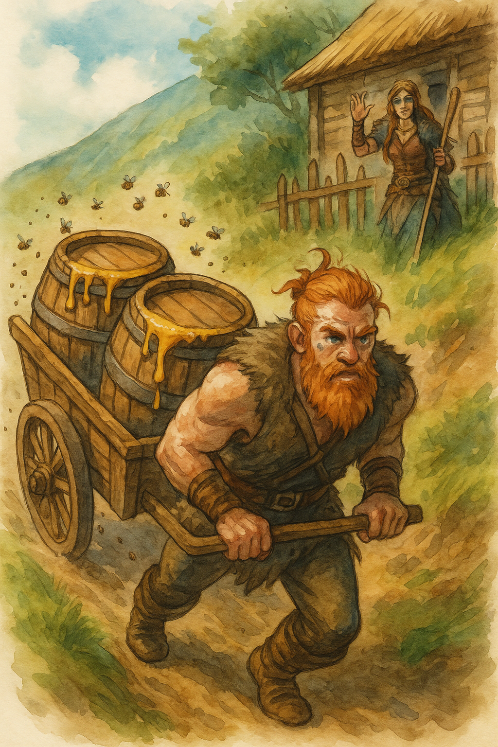 Eines Tages schien das Gerede um Bjornar lauter als sonst. Von einem „großen Unglück“ war die Rede, einer Liebe, die keine war, einem Herz, das gebrochen wurde. Man sagte, Ynge, habe Bjornar zurückgewiesen – nicht mit Zorn, sondern mit einer Kälte, die nur wahre Enttäuschung bringt. Gewalttätig soll er geworden sein, und anderes. Die Schwitzhütte fand man voller zerschlagener Honigtöpfe. Wenig später, so raunte man, habe Bjornar kaum noch gesprochen. Brummte, knurrte, verlor die Worte, schleppte sich herum, wie ein verletztes Tier. Manche wollten gesehen haben, wie Tränen über sein Gesicht liefen. Tränen? Bei Bjornar? Der heulte doch ständig. Diesmal war es als hätte der Schmerz ihn verwandelt.