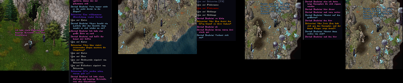 Als er dort eintraf, wartete die Priesterin schon, auch hier wollte er keine Zeit verlieren und die Priesterin auch nicht unnötig aufhalten. Vorsicht war die Mutter der …. wie dem auch sei, er erklärte ihr, dass er einen Auftrag hätte und dafür bräuchte er Kristalle rein ohne Einschlüsse und eingeschlossener Magie. Sie bot ihm an, dass sie ihn begleiten würde, dass er sich umschauen könne. Bei der Frage, was es ihn kosten solle, bekam er nur die Antwort ….das besprechen wir später wenn du welche gefunden hast. Unten im Untergrund angekommen, fand er auch schnell einige Kristallablagerungen die auf den ersten Blick geeignet wären, wären sie nur ein wenig größer. So gingen sie tiefer in die Höhle und wurden schließlich nach einer Zeit von 20 Augenblicken fündig. Er suchte sich einige Exemplare aus die für sein Vorhaben geeignet erschienen und baute diese vorsichtig ab, schließlich wurden sie gut verpackt und sie machten sich wieder auf den Weg zur Oberfläche.