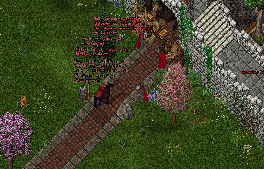 Nachdem Daron das Schreiben von Fenria erhielt welches ihm die Befehlsgewalt über die die Stadtwachen von Silberburg ermöglichte machte er sich sofort auf den Weg um am Hafen nach dem rechten zu sehen. Dort angekommen fand er nervöse Wachleute vor welche den Eingang zum Hafen vorbildlichst bewachten. Daron sprach den Wachmännern Mut zu und lobte jene für Ihre Tapferkeit im Kampfe gegen die Unbekannte Seuche. Doch auch weiterhin eine erhöhte Aufmerksamkeit forderte er von jenen ein. Sobald sich die Lage verändert vor Ort wollte der Paladin kontaktiert werden.