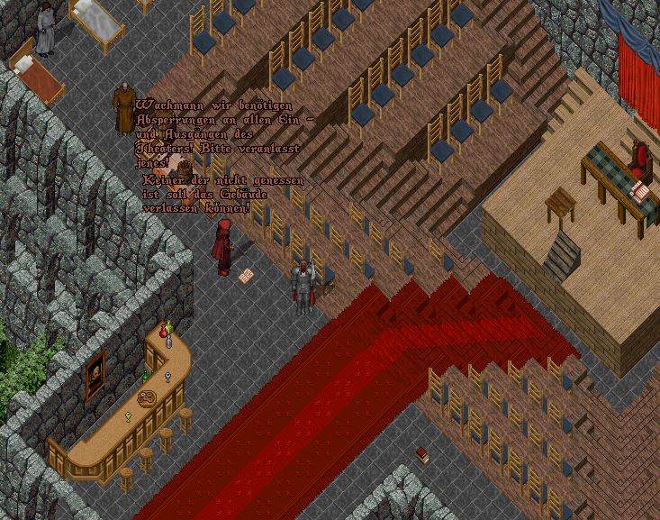 Das Theater wurde abgeriegelt und die Wachmannschaften verdoppelt. Ein ungewolltes Verlassen des Theaters sollte nicht mehr möglich sein! Solltet Ihr weitere Aufträge für mich haben so wendet euch bitte an mich! Vielleicht sollten wir nochmal über Eure Idee sprechen mit geballter Stärke der Paladine das Böse im Hafen zu bannen.