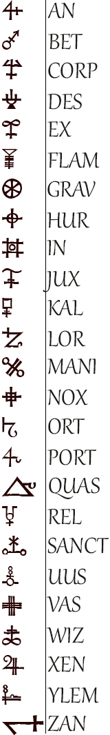 Ort: Dieses Wort der Macht bedeutet übersetzt "Magie". Es wird verwendet, um den Zauber in seiner magischen Wirkung zu verstärken, wird der Hauptbestandteil des Zaubers ja aus dem Feuer bestehen, wirkt es sich auf dieses auch aus.