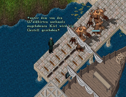 Mithilfe herbeigerufener Waldhirten und der tatkräftigen Unterstützung weiterer Hochelfen, wurden die verbliebenen Überreste des alten Fährschiffes an Land gehievt, und dort auf ein Gerüst aufgedockt.