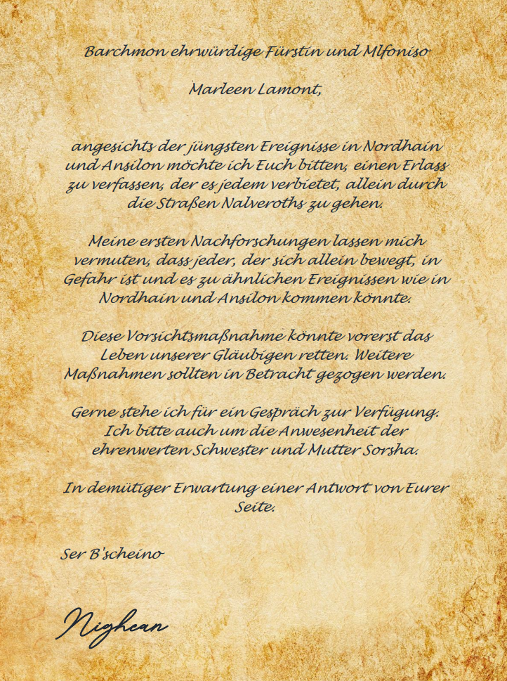 durch innere Verfahrensweisen bei den Dienern des Namenlosen gelang ein Schreiben an die Fürstin Marleen Lamont.