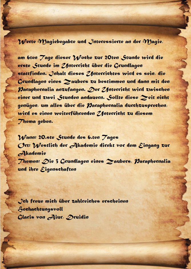 Es handelt sich um ein Angebot für einen jeden, der Interesse an der Magie hat. Selbstverständlich wird jegliche Art von Störung mit dem Ausschluss aus der Vorlesung bestraft. Jegliche offensive Handlung gegenüber Teilnehmern des Unterrichts wird nicht geduldet. Unter diesen Aushang werde ich in regelmäßigen Abständen den Zeitpunkt und den Ort der nächsten Vorlesung bekanntgeben.